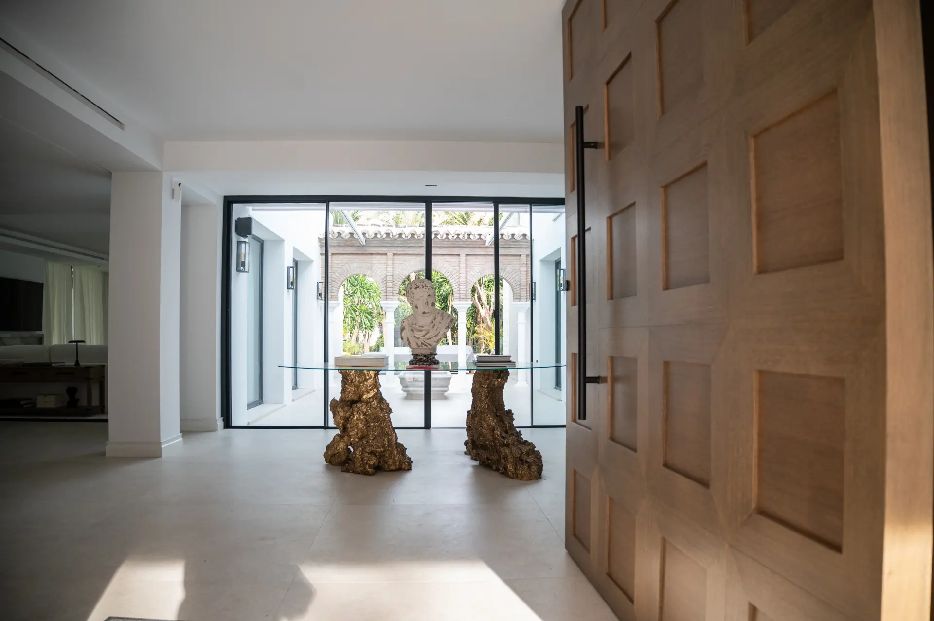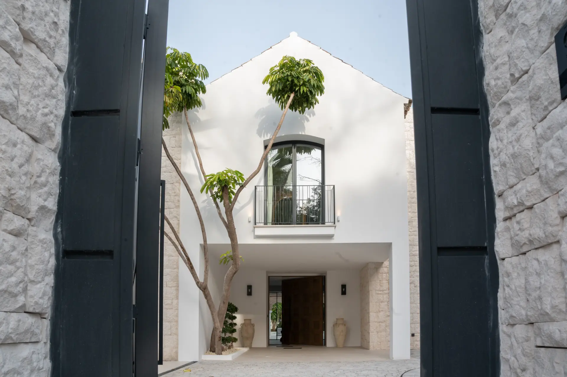 Accediendo por un portón imponente, la vivienda da la bienvenida con una fachada limpia, revestida en blanco y piedra natural, donde la vegetación cuidadosamente integrada aporta carácter y serenidad desde el primer instante.
